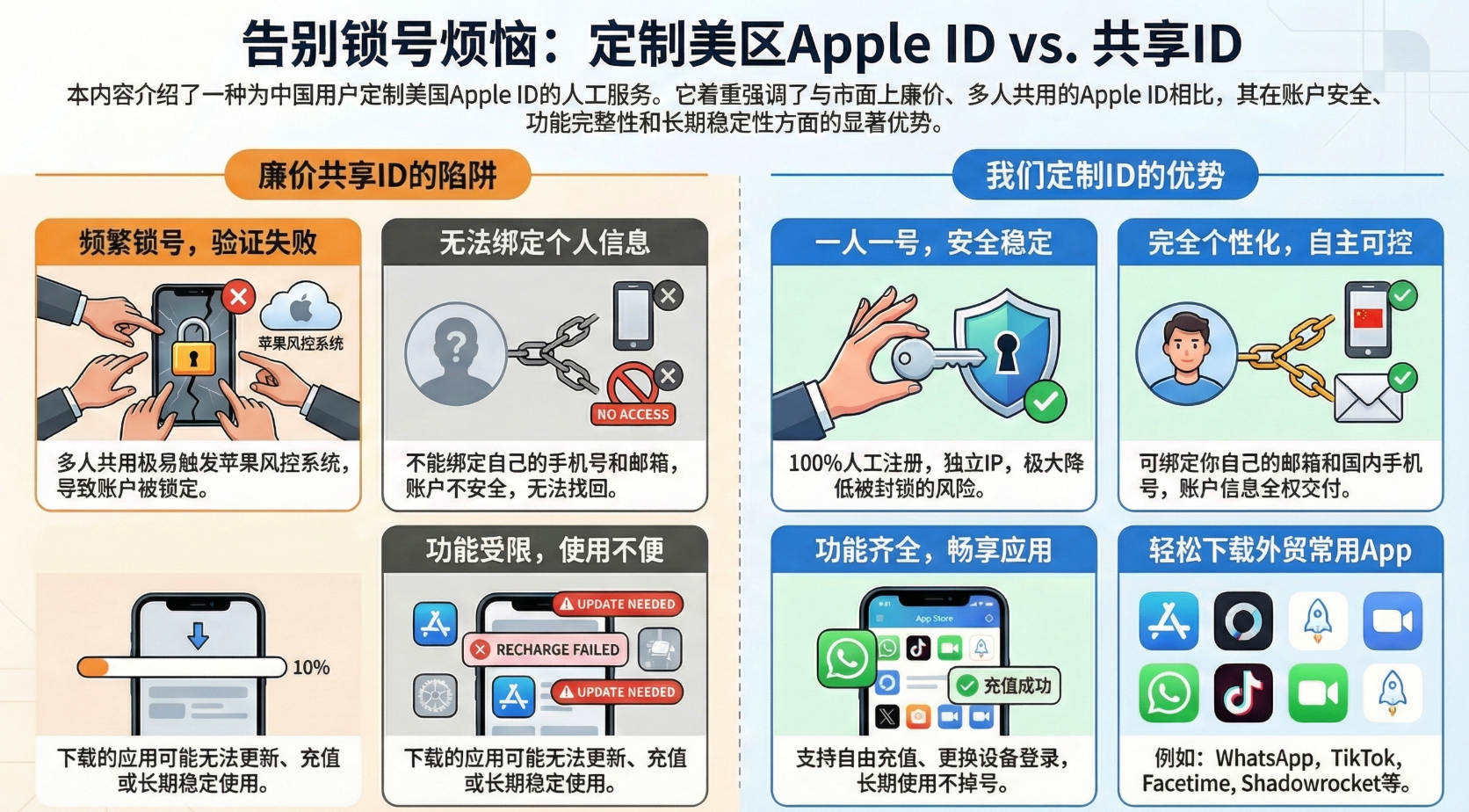 高端定制美国Apple ID服务,人工一对一注册,可绑定国内手机号与自定义邮箱,稳定下载TikTok/WhatsApp等外贸常用软件,支持充值、绑定、二次登录,非共享不锁号。