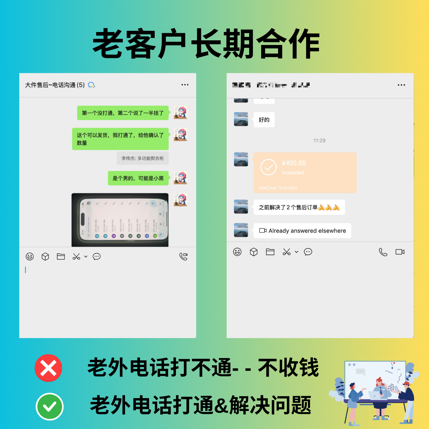 跨境卖家必备!我们安排懂外贸的英语专八客服代你联系买家,通过英文电话快速沟通售后问题,降低差评风险,特别适用于高价值大件商品的退货处理。