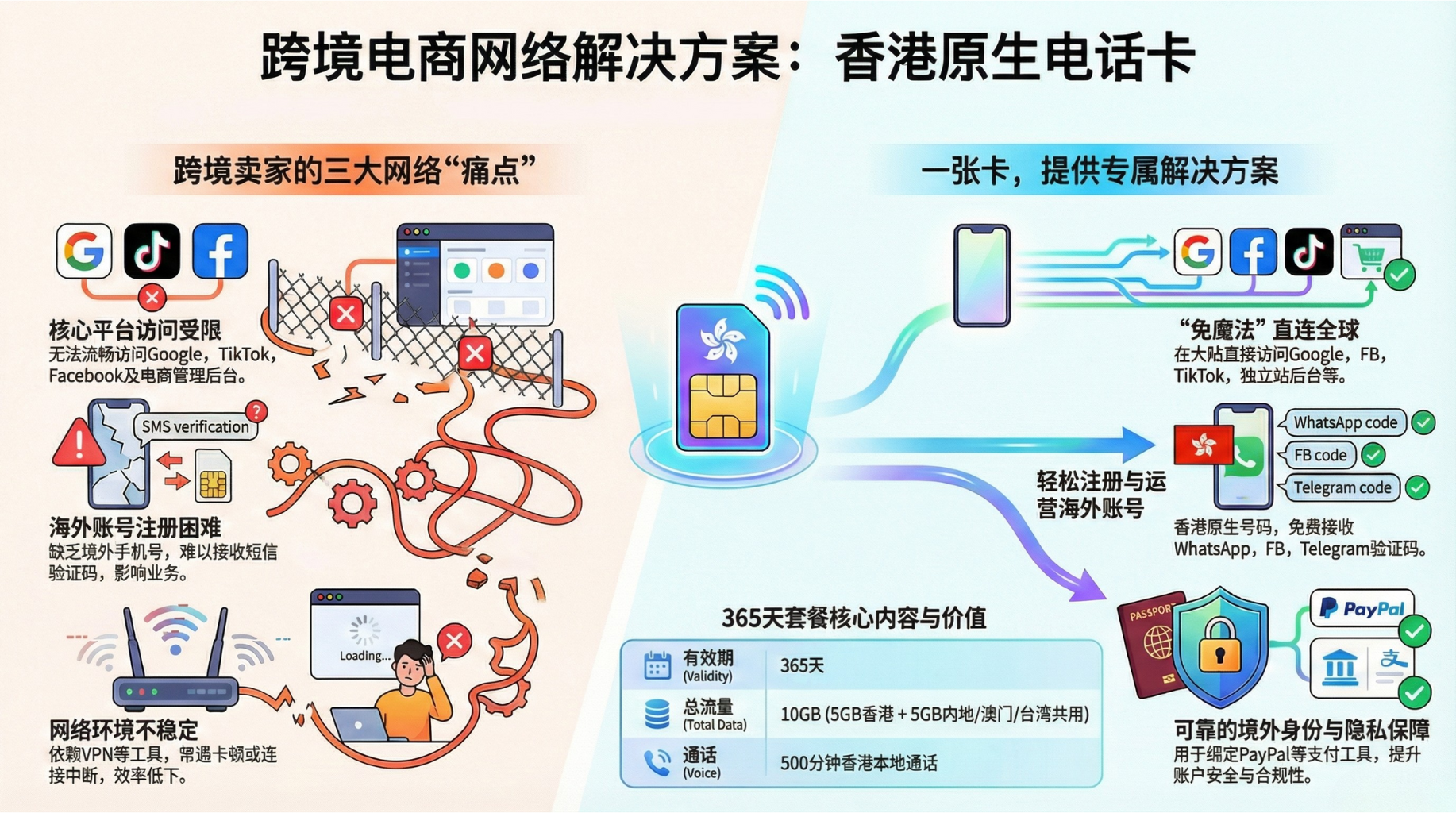 尊敬的跨境电商卖家朋友们,您是否正为中国大陆地区访问海外平台受限而烦恼?是否苦于无法高效注册和运营海外社交媒体账户,影响业务拓展?这款香港原生号码电话卡正是为您量身打造的高效解决方案,助您在跨境电商的战场上如虎添翼,沟通无碍,业务倍增!