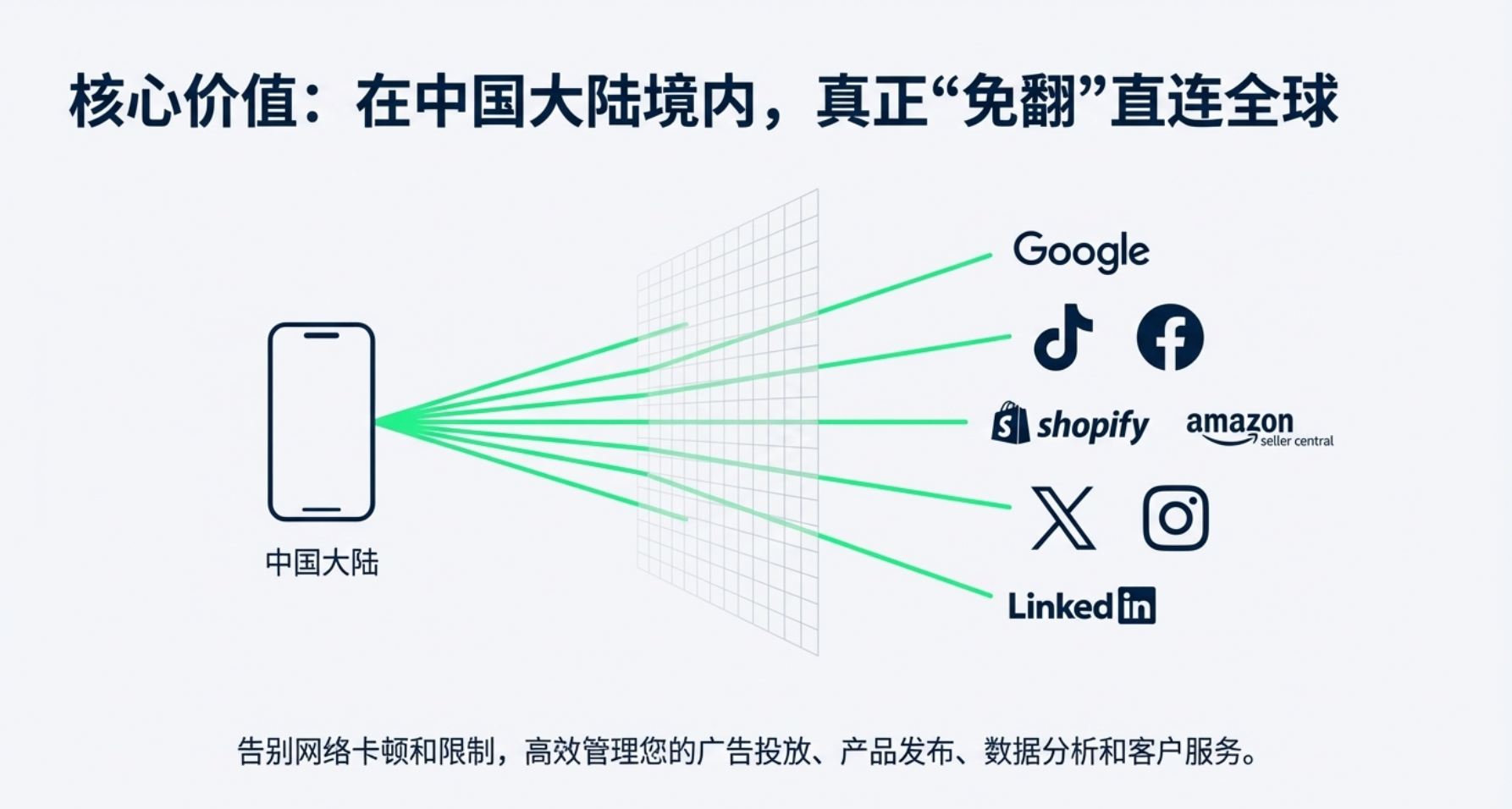 中国大陆地区“免魔法”直连全球核心平台: 这是本卡对跨境电商卖家最大的价值所在!无需复杂的VPN配置,在中国大陆境内即可直接、流畅地访问 Google、YouTube、Facebook、Instagram、TikTok、X (Twitter)、LinkedIn 等国际主流平台,以及您的独立站管理后台、亚马逊/eBay/速卖通卖家中心等。告别网络卡顿和限制,高效管理您的广告投放、产品发布、数据分析和客户服务。