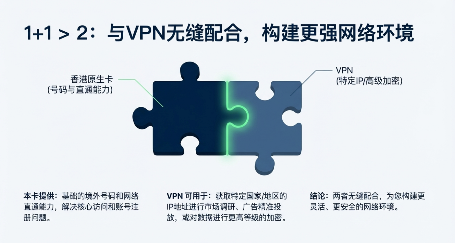与VPN完美配合,功能叠加: 尽管本卡已支持大陆直连大部分海外服务,但我们深知跨境卖家在特定场景下仍可能需要VPN(例如,用于获取特定国家/地区的IP地址进行市场调研、广告精准投放,或对数据进行更高等级的加密传输)。本卡提供基础的境外号码和网络直通能力,能与您的VPN工具无缝配合,为您构建更灵活、更安全的网络环境。