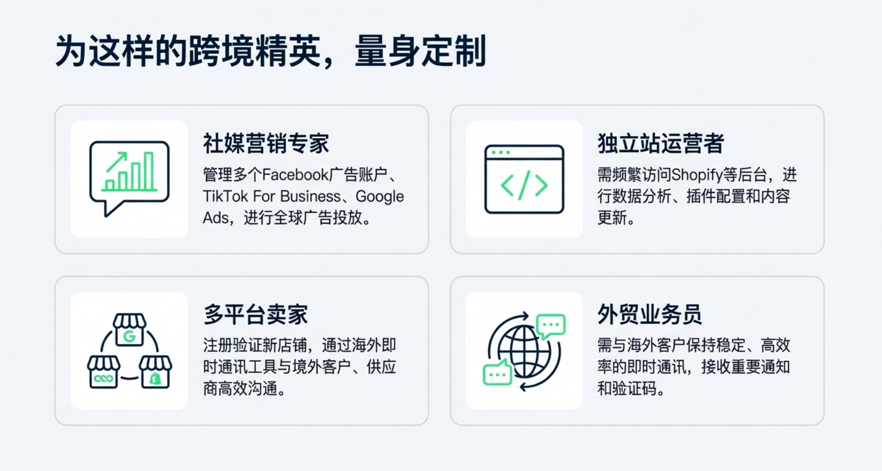 外贸业务员: 需与海外客户保持稳定、高效率的即时通讯,接收重要通知和验证码。