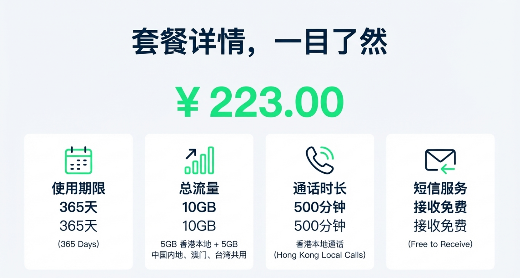- 5GB香港本地流量+5GB中国内地、澳门、台湾共用+500分钟香港本地通话时长