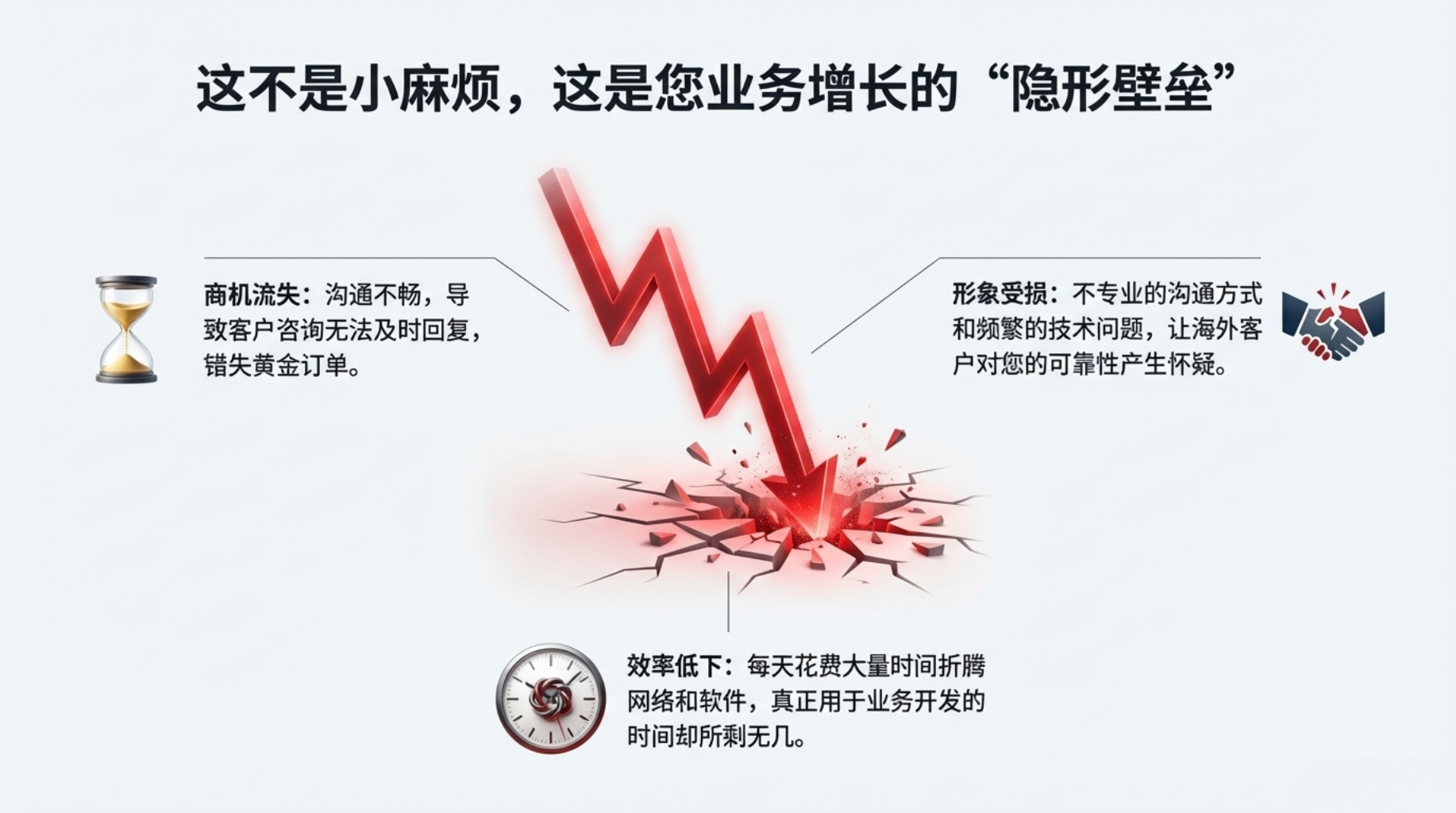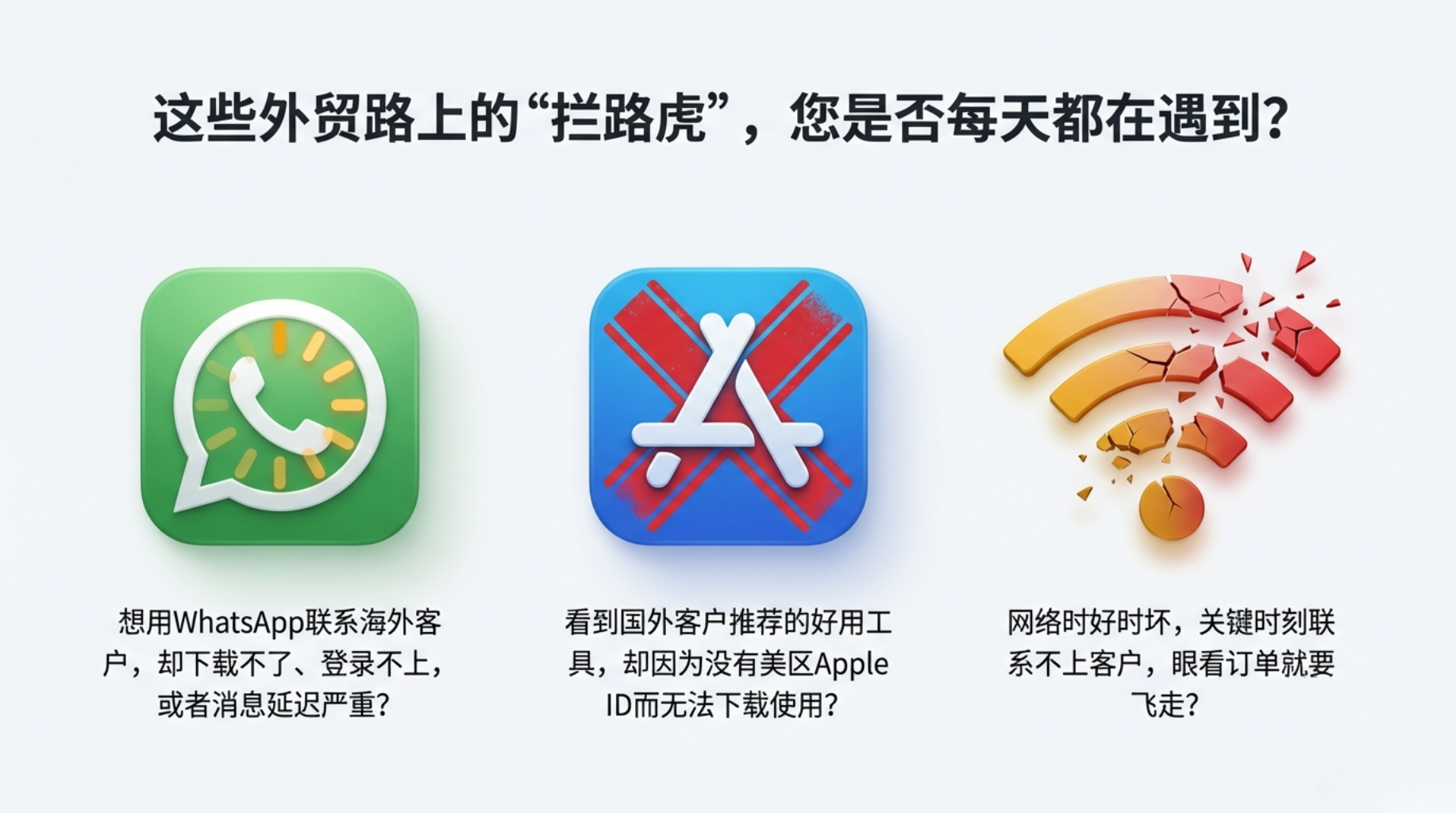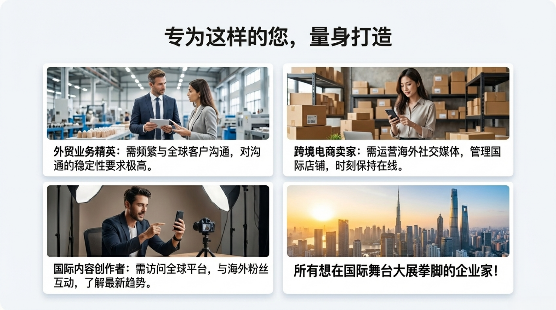 核心痛点解决: 解决国内网络环境对国际商务应用的限制,实现稳定、流畅的全球连接。