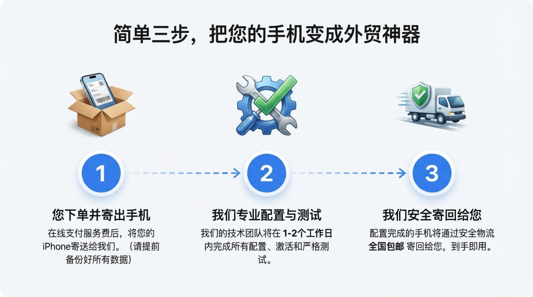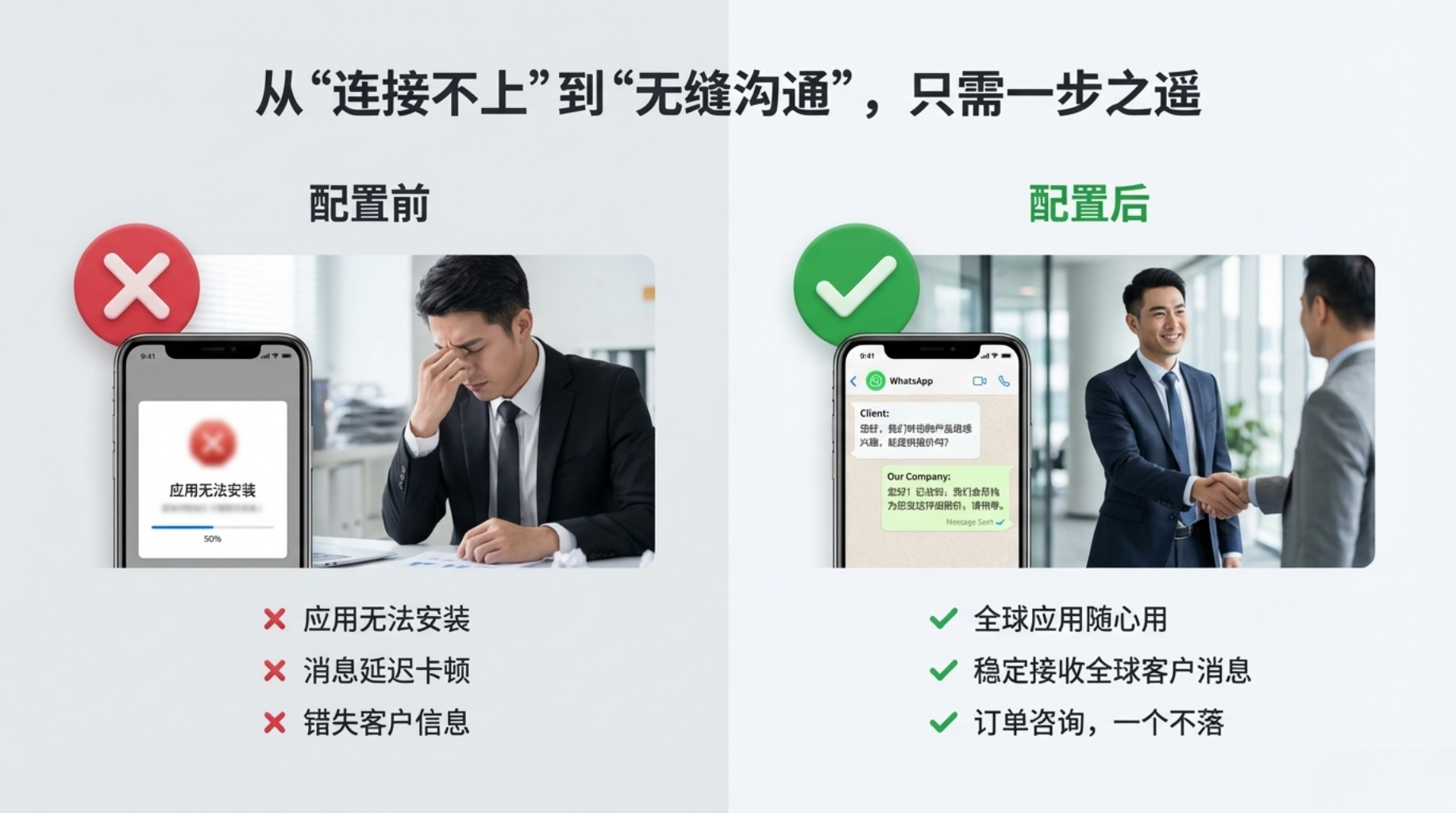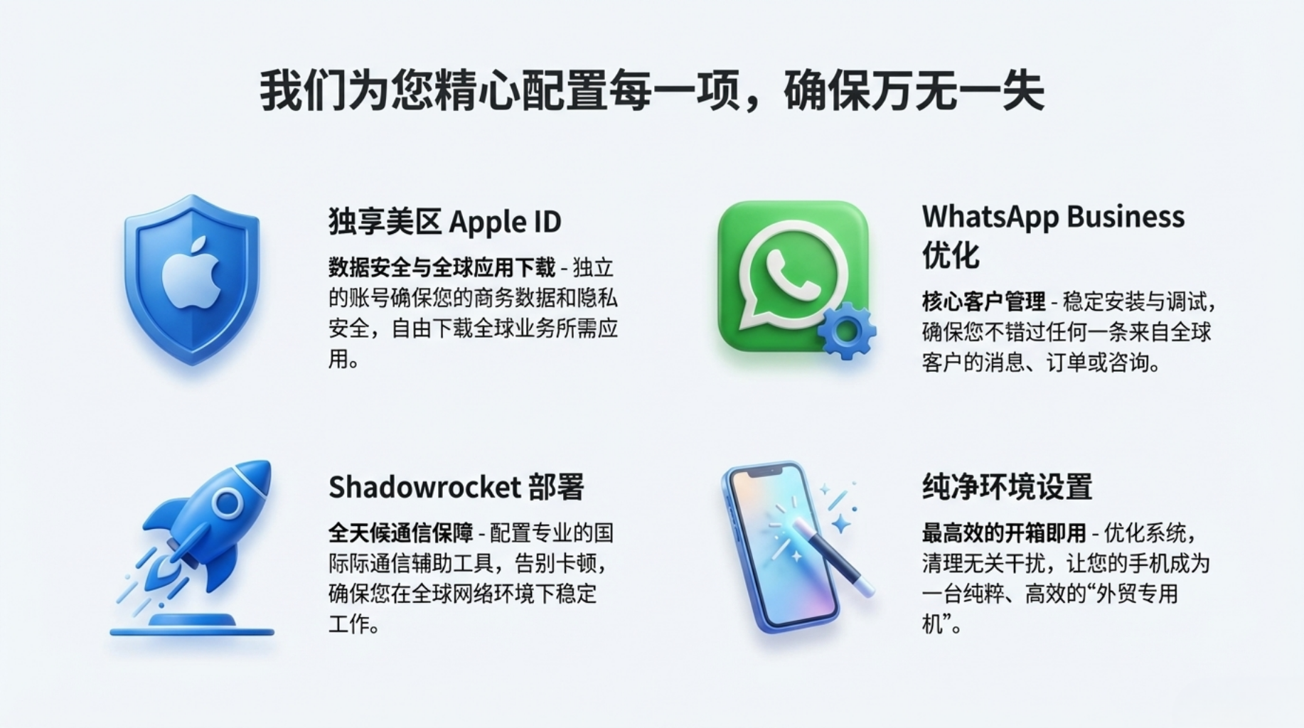 您是否厌倦了为国际应用环境配置而耗费时间?我们的专业配置服务为您解决所有技术障碍。只需提供您的手机,收到即可开始高效的跨境工作。